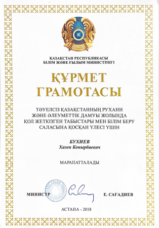 демалысына шыққан білікті басшы, ұлағатты ұстаз – Бухиев Хазен Қоңырбайұлы. Өмірден өз орнын тапқан талай жұмыр жүректі пенденің, кәсіптік саладағы тұсауын кесіп, біліктілігін арттырған Хазен Қоңырбайұлы 1959 жылдың 22 ақпанында Атырау облысы, Жылыой ауданы, Қара-арна елді мекенінде мұнайшы отбасында дүниеге келді. Әділдік пен адалдықтың ақ туын биік ұстаған әкесі Бухиев Қоңырбай Бірмағанбетұлы мен мейіріміндегі мөлдір махаббаттың әр тамшысы алтынан да қымбат анасы Бухиева Сали Нүрекешқызының ата-аналық бесігінде тербеліп, өмірлік құндылықтар мен адами асыл қасиеттерді бойына сіңіріп өсті. Руы Таз-жантай-Келдібай-Меңілшек ұрпағы. 1960 жылы ата-анасының жұмысына байланысты Жылыой ауданы, Құлсары мекеніне қоныс аударған Хазен Қоңырбайұлы Құлсарыдағы А.Чехов атындағы 8 жылдық мектепті бітіре сала, сол кездегі №84 кәсіптік-техникалық училищеде білімін жалғастырады. Қолына алған қандай істі де шыр айналдырып алып кететін, қолының икемі бар, тек алға ұмтылып тұрған жас маман кәсіптік-техникалық училищені ойдағыдай тәмамдаған соң, өзінің алғашқы еңбек жолын теміржол саласында бастады. Бірақ «Ат айналып қазығын табады» дегендей, арада екі жыл өтер-өтпесте Хазен Қоңырбайұлы өзі түлеп ұшқан оқу ордасына қайтып оралады. Міне, осы уақыттан бастап кәсіптік білім беру саласындағы ұзақ жылғы еңбек жолы басталады. Өндірістен қол үзбей жүріп сол кездегі Гурьев политехникалық техникумында білімін жалғастырып, «Техник-механик» мамандығын алып шығады. Колледжде қызмет етіп жүргенде Орал қаласындағы Қазақ инновациялық және телекоммуникациялық жүйелер университетінің «Кәсіптік оқыту» мамандығына оқуға түсіп, оны да ойдағыдай тәмамдады. Қазіргі таңда өзі түлеп ұшқан білім ордасы Атырау облысы, Жылыой ауданы, Құлсары қаласындағы Жылыой мұнай және газ технологиялық колледжі «Қазақ мұнайының атасы» - Сафи Өтебаев есімін иеленіп, Атырау аймағындағы іргелі білім ордасына айналды. Міне, осы оқу ордасында жоғары білімді майталман маман 2000 - 2010 жылдары аралығында өндірістік оқыту шеберімен бірге Бас механик қызметін де абыроймен атқарды. Ал 2011